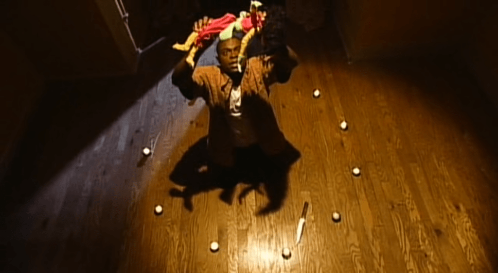 The movie starts with local loser Michael striking out with Jada, a girl who goes to school with him. Expository dialogue ham-fistedly establishes that Jada is dating T-Bone, a local thug who rolls into the scene as if summoned by his name, and makes it clear that Michael should stay away if he knows what’s good for him. In a normal film, Michael is our protagonist, right? A bullied nerd trying to get the girl. I mean, T-Bone has goons for crying out loud, he’s clearly the hometown bully. However, we cut instead to Michael performing a black magic ritual in a circle of candles, a clown doll raised in his hands: “Come alive, Killjoy! Come alive!” Honestly, I can’t imagine having a much different response in high school myself. Michael’s incantations are interrupted however, when T-Bone’s crew shows up outside, and forces Michael to get in the car with them. Baby Boy and Lorenzo say that they only mean to intimidate him, but T-Bone takes things too far, and ends up shooting Michael, killing him on the spot.