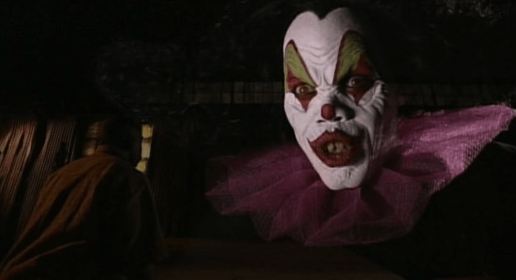 One fun thing about the movie club is that we’re really willing to watch almost anyone’s movie pick, no matter how off the beaten path it is. Previous highlights include For Y’ur Height Only (1981) and The Holy Mountain (1973); we get to see movies we’d sometimes never otherwise watch because the decision is made by a different person each week. This week, it was my turn to pick a movie, and I continued the theme of facing our fears, taking on my fear of clowns with Killjoy (2000). This twisted tale of an evil (drug dealing?) clown carrying out the revenge of a high school outcast came to my attention when Youtuber Brutalmoose made a video review about it a few years ago, and I was happy to have an excuse to finally sit down and watch it. Sure, there are plenty of other, perhaps more frightening, clown movies that I could have gone for, but something about the low budget, early 2000’s filmmaking called to me, and this rotating seat is a dictatorship, not a democracy. Hey, it was between this and Halloweentown 4; read on to see if the gangster-capping clown left us laughing or crying!
