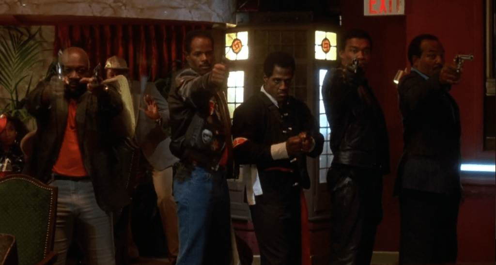 This film appears to be a bit of a passion project for Keenen Ivory Wayans, who wrote, directed, and starred; Wayans built connections in Hollywood for five years before earning the credibility to direct I’m Gonna Git You Sucka. The movie is unrelenting in its comedy, I think within any given minute of the runtime, someone in our viewing party was smirking if not laughing. The humor was also much more modern compared to the last comedy we watched together, History of the World, Part I (1981); I’m Gonna Git You Sucka is a den of absurdist comedy that doesn’t stray too far into being derogatory. The jokes never feel like they’re laughing at someone, but rather the situations they find themselves in, and in the few cases where someone is the butt of the joke, it’s usually because the scene has become completely ridiculous, like when Jack finds himself on a date with a bald woman with a prosthetic leg, breasts, and ass. This movie shares a sense of humor with Airplane! (1980), and has a momentum to it that keeps any of the jokes from going on too long. I think what I loved most about this movie was that it never took itself too seriously; it’s a commentary without fully tipping beyond the point of comedy. I also loved how many audio gags this movie has (also pointed out by Jazzy!). Even subtitles fail to capture how funny it is to hear Damon Wayans falling down stairs offscreen over several lines of dialogue, or Kim Wayans going ham on a very loungy rendition of “When the Saints Go Marching In”.