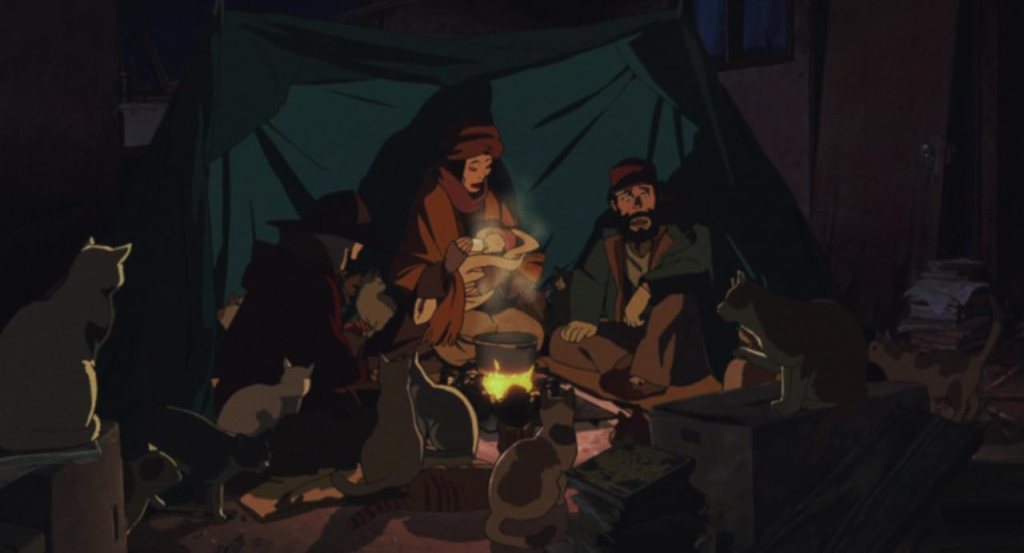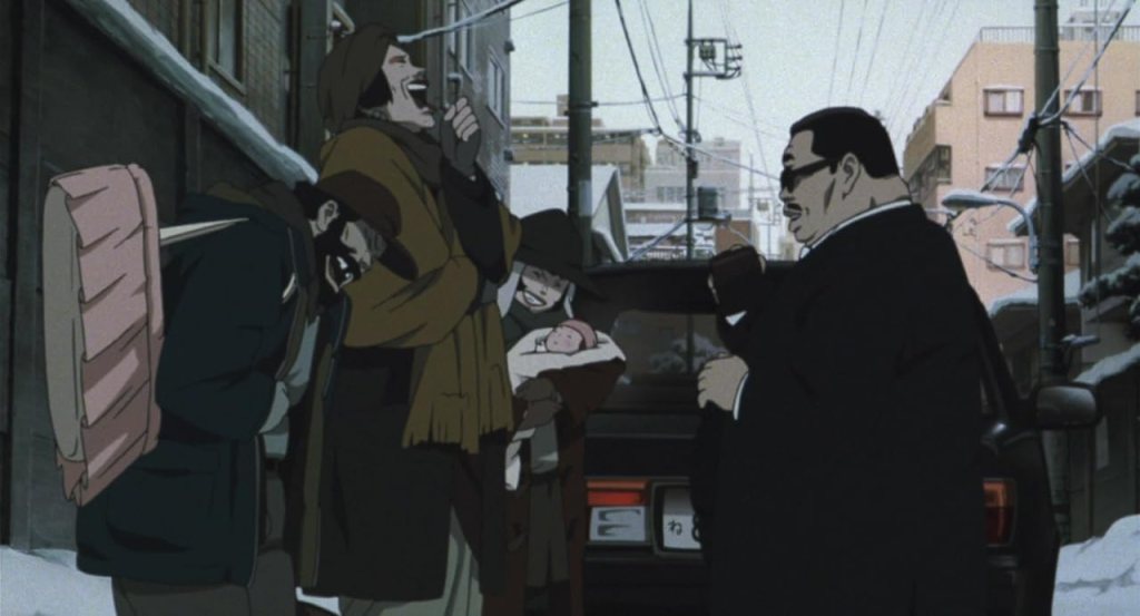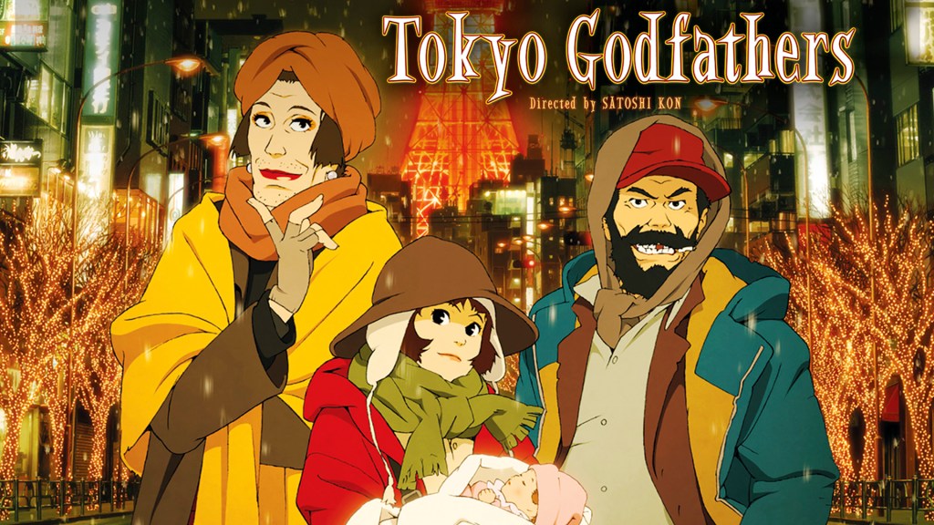 Tokyo Godfathers is a story about three homeless people living in Tokyo, Miyuki, Hana, and Gin, who find an abandoned baby in the trash on Christmas eve. A product of the foster system herself, Hana names the foundling Kikiyo, and begs for help from the other two in reuniting the child with her family, and the three set off on an adventure to return baby Kiyoko to her parents. Along the way, the three interact with an eclectic assortment of communities, including an underworld crime family, a group of gay entertainers, and a neighborhood watch. As the trio traipse through the different social circles, they learn more about each other, and each experience a Christmas miracle of their own.
