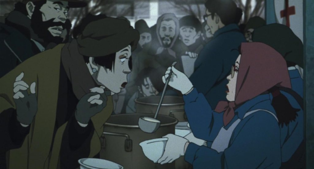 Ken’ichi Konishi was the character designer along with Satoshi Kon on this film, and I think a lot of work went into the three protagonists, especially Miyuki, who looks an awful lot like Paprika to me. I appreciate that we see these characters at multiple points in their lives during this movie. Many of us feel reflective at the end of the year, and I think that comes with the territory of a holiday movie. Knowing the different characters’ backstories also makes a rewatch more interesting, as we’re able to pick up on little details like Gin being upset with Hana naming the baby Kiyoko, rather than the naming in general, or the newspaper Miyuki reads displaying the message “Angel is safe.” These details add a lot of depth to the characters, and is part of why I find myself enjoying this movie so much. The film also has some beautiful animation, and having just visited Tokyo myself, I loved seeing all the detailed backgrounds.