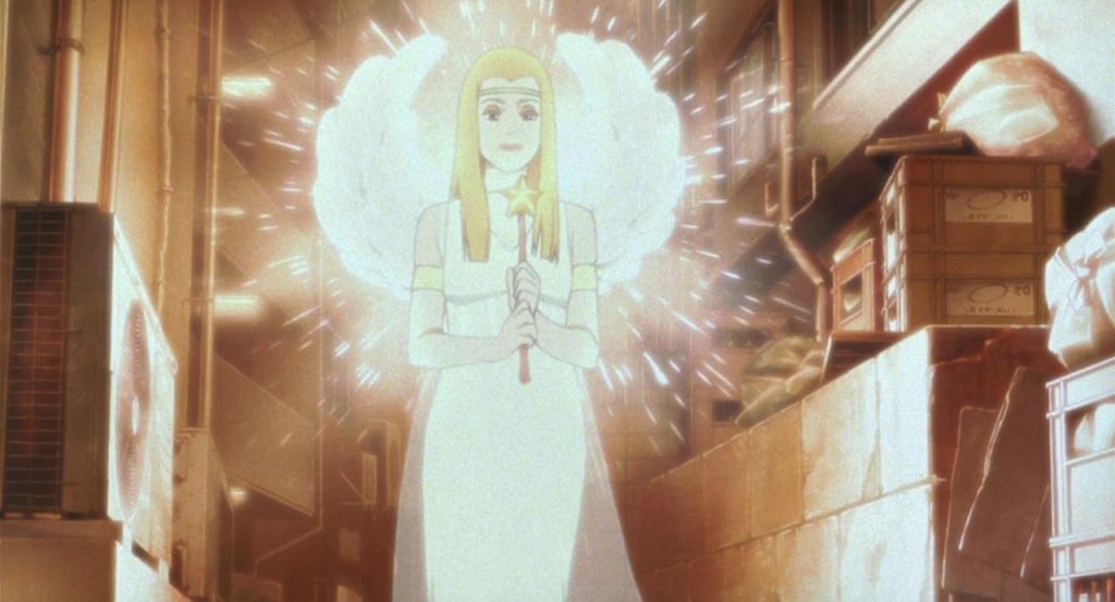 Something I noticed while we were listening to the dub was that they changed the Angel who finds Gin’s voice to be more feminine in English, rather than a voice that implied she was a crossdressing man in Japanese. It doesn’t change much, but it was interesting how that context changed how I interpreted Hana’s mother’s bar from being an overtly gay bar to being more of a party bar. However, despite this change in context, both voice performances work for the scene. So much of this movie is told from specific perspectives, and we’re presented with how different characters perceive the world at different points in the movie. For example, when Gin explains that he is a former cyclist, we see an image conjured in Hana and Miyuki’s heads of what he looked like. That image is then updated when we later learn that he wasn’t a cyclist, but owned a bicycle store. Similarly I think that the Angel’s voice we hear is entirely what Gin is perceiving in that moment. It makes me want to re-watch the movie with an eye for times when characters are being unreliable narrators like that.