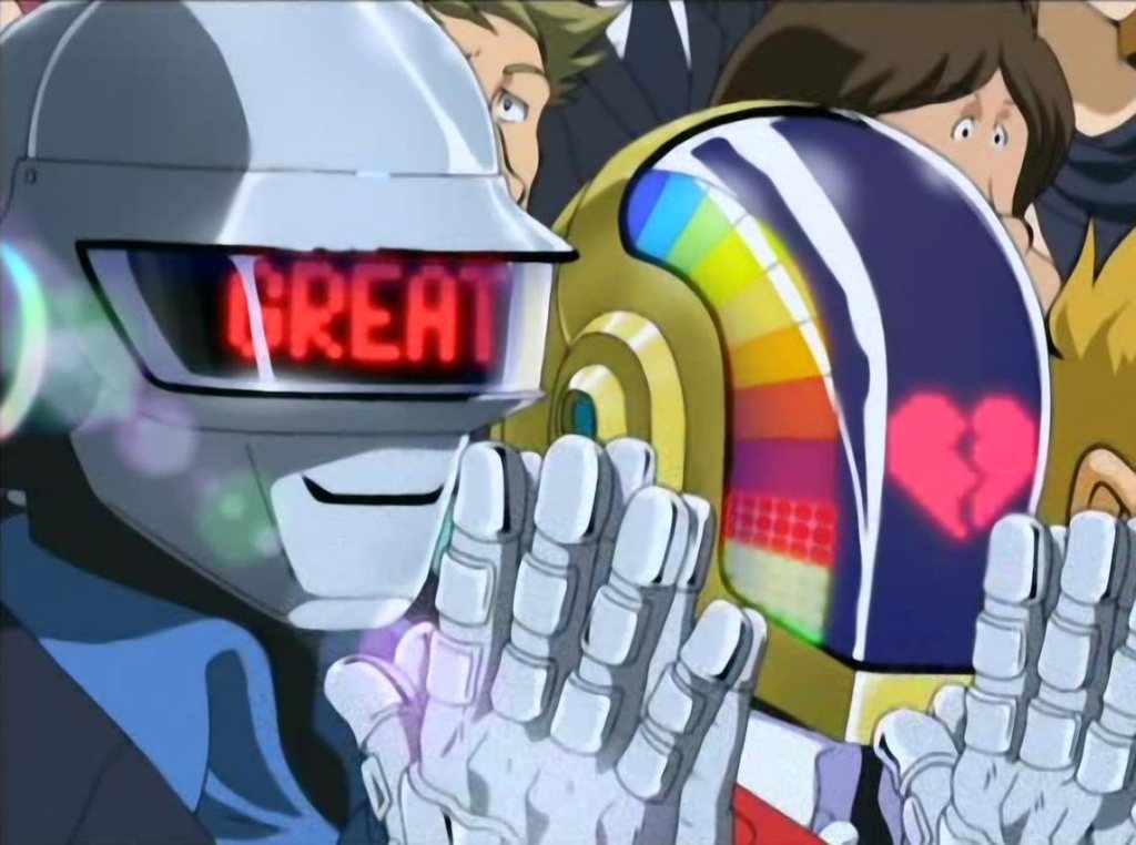 It’s hard to deny how cool it is to see Matsumoto’s character designs set to this music, even if the cast is suffering from a slight case of same face syndrome. Three of the Crescendolls, Stella, Arpegius, and Baryl, are dead ringers for Maetel, Captain Harlock, and Tochiro from Galaxy Express 999. The action moves at a fast pace, and it’s exciting to pick out easter eggs in the background of the hour-long special. More than anything, the music is phenomenal. Early Daft Punk doesn’t have all the polish that they’re known for now; I don’t mean to say that any of the music is bad, but I appreciate that they weren’t all radio songs, and were well suited to animation. My only critique is that some of the animation feels as though it was made without knowing what the accompanying music would be. Why is “One More Time” the theme of the Crescendolls when it only features two of their instruments? It makes me wish that the animators spent a little more time to figure out what instruments would have produced the sounds of Daft Punk’s music rather than going for the more generic rock band aesthetic.
