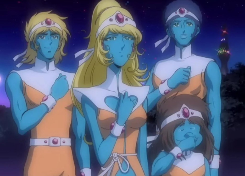 Interstella 5555 tells the story of four alien performers who are abducted and brainwashed into being a musical act on earth. The far out premise upends science fiction tropes about aliens by having humanity being the abductors this time, forcibly removing the band from their home planet, painting their skin in human flesh tones, and replacing their memories with facsimiles set on earth. The mastermind behind this plan is the Earl de Darkwood, an evil music producer who kidnaps alien performers and forces them to play music in a quest for 5,555 golden records, which he plans to use as the catalyst in a dark ritual. Thankfully, an alien astronaut is sent to save the band, and helps them reclaim their memories and identities before he’s tragically gunned down during the rescue. This kind of noble sacrifice feels right at home in Matsumoto’s works, and is a theme in several anime titles he’s worked on. After defeating the Earl, the record company owner calls in a few favors, and humanity takes responsibility for their unethical artist acquisition by pooling their resources together to send the alien band home.